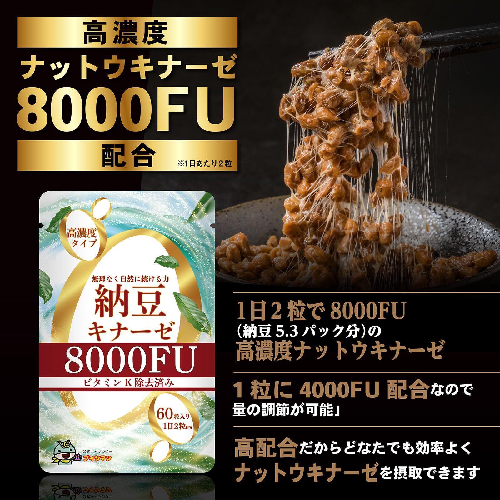 納豆キナーゼ 8000FU 紅麹不使用 高濃度 ナットウキナーゼ 無味 無臭 ビタミンK除去済み サプリメント 60