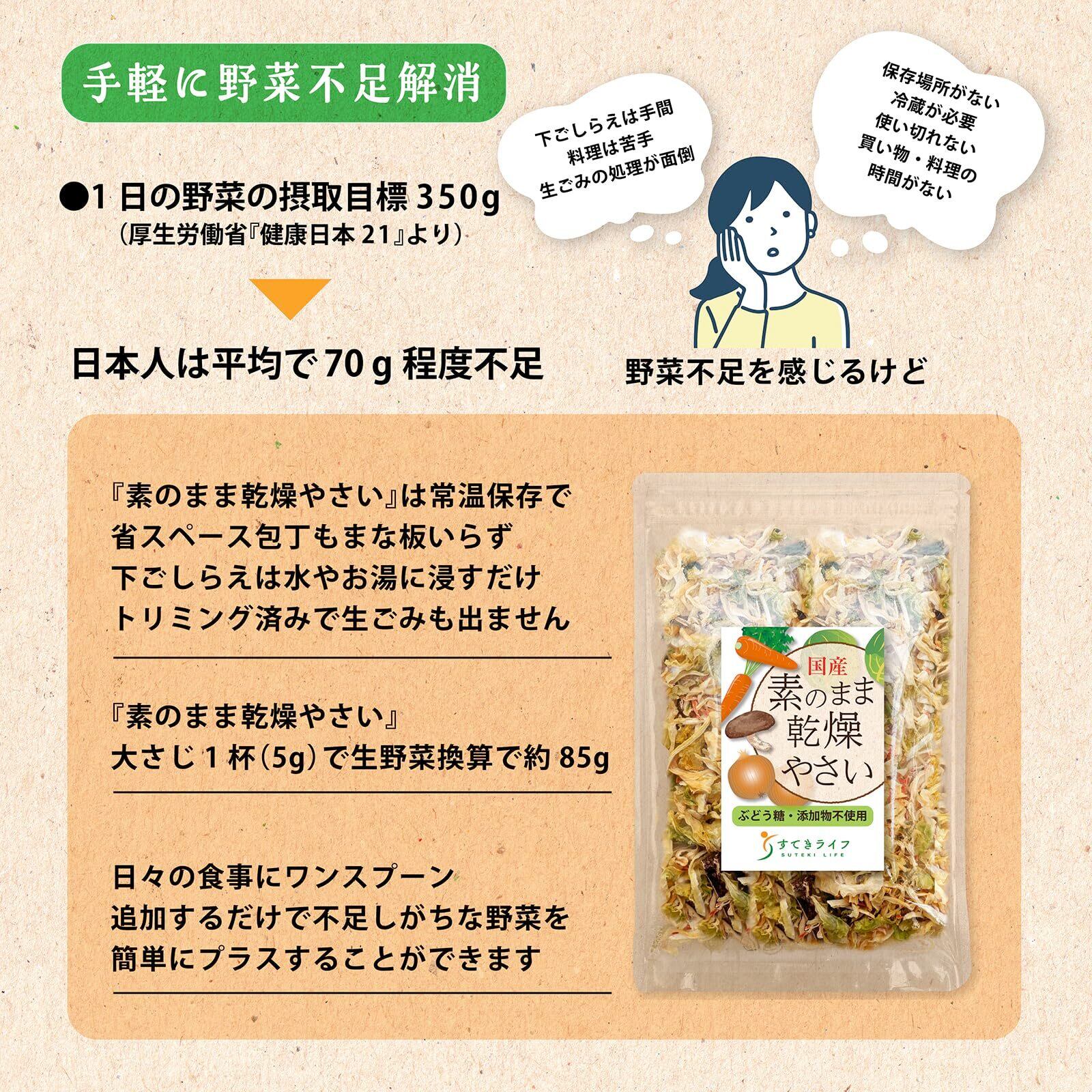 ✅【❗素のまま乾燥やさいで簡単に野菜不足解消❗】厚生労働省が健康づくりのために提唱した『健康日本21』で、野菜の摂取量の目標値として1日あたり350g掲げられています。 一方、日本人の平均野菜摂取量は、1日あたり280g程と言われています。野菜不足を感じていても、生野菜は、冷蔵が必要、保存場所をとる、使い切れない、買い物に行く時間がない、下ごしらえに手間がかかるとなかなか摂取できない方も多いです。「素のまま乾燥やさい」大さじ1杯(約5g)で生野菜に換算すると約85gになります。保存も常温で場所も取りません。下ごしらえは水やお湯に浸すだけ。日々の食事に「素のまま乾燥やさい」をワンスプーン追加することで不足しがちな野菜を簡単にプラスすることができます。