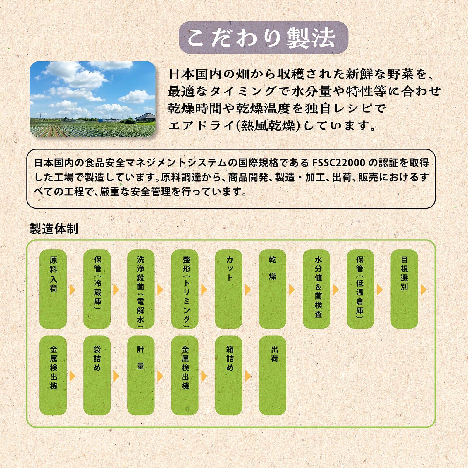 ✅【❗素のまま乾燥やさいのこだわりエアドライ製法❗】 日本国内の畑から収穫した野菜をカットして、それぞれ最適なタイミングで各々の水分量や特性等に合わせ乾燥時間や乾燥温度を変える独自レシピでエアドライ(熱風乾燥)しています。野菜そのものの持つ栄養・旨み・甘みがギュっと凝縮された、適度な歯ごたえが特徴の美味しい乾燥野菜です。そのまま乾燥することで、水分のみが抜け野菜そのものの旨みと甘みが凝縮され、長期保存することが可能になります。生野菜よりも保存しやすく、手軽に、無駄なく、必要なときに調理でき、美味しく野菜を摂取することができます。