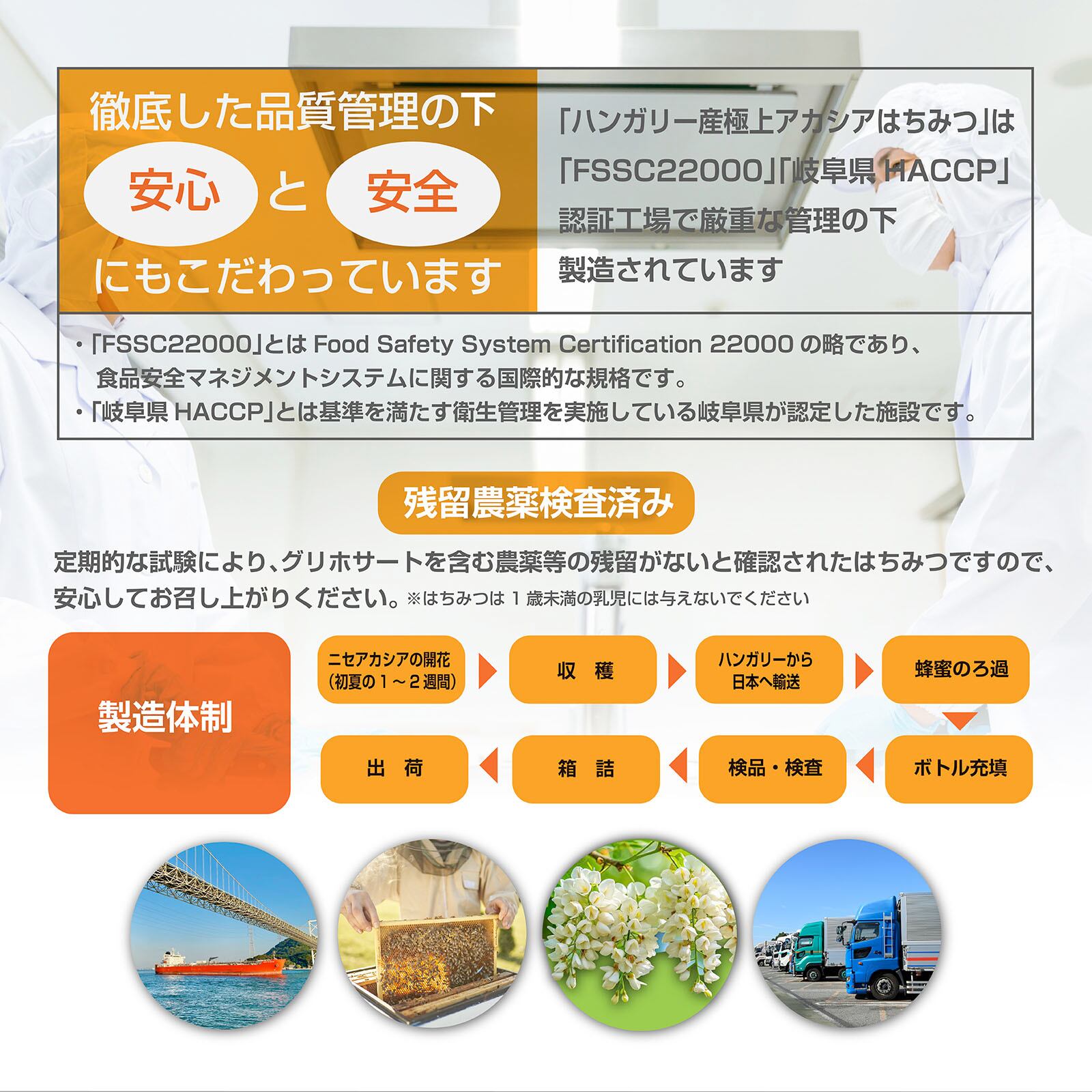 ✅【❗極上アカシアはちみつは岐阜県HACCP認証工場で厳重な安全管理の下で製造❗】 ハンガリー産極上アカシアはちみつはFSSC22000:岐阜県HACCP 認証工場で、原料調達から、商品開発、製造・加工、出荷、販売におけるすべての工程で、厳重な安全管理を行っています。 「FSSC22000」とはFood Safety System Certification 22000の略であり、食品安全マネジメントシステムに関する国際的な規格です。 「岐阜県HACCP」とは基準を満たす衛生管理を実施している岐阜県が認定した施設です。