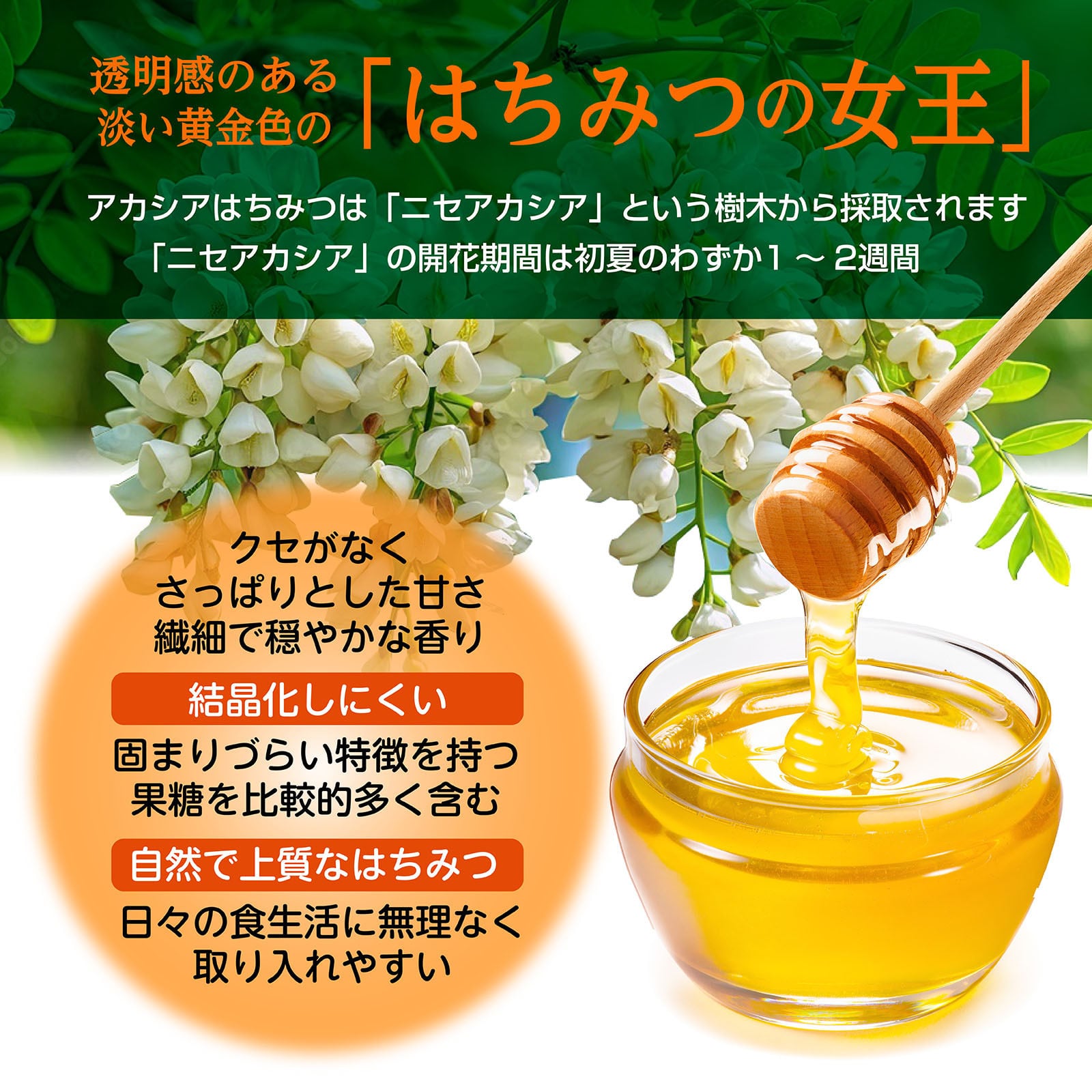 ✅【❗クセがなくさっぱりとした甘さと繊細で穏やかな香り❗】 極上アカシアはちみつは「ニセアカシア」という樹木から採取されるハチミツです。甘みがすっきりとしていて上品な味わいです。クセがなく、さっぱりとしているため、素材や料理の風味を損ねません。優しく繊細な香りで、誰からも好かれるその味わいから、アカシアハチミツは別名「ハチミツの女王」とも呼ばれています。 ニセアカシアの花は、初夏にわずか1週間ほどしか開花しないのでその短い期間で採取されるため、アカシアはちみつはとても希少です。