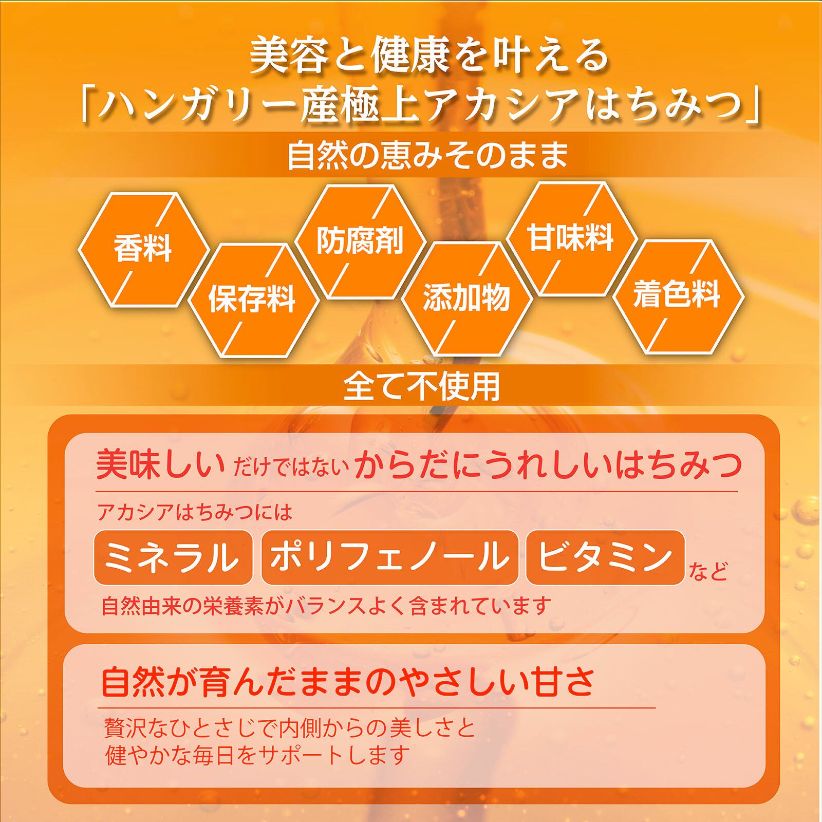 ✅【❗世界が認めた希少なハンガリー産アカシアはちみつ❗】 極上アカシアはちみつは日本に輸入されるはちみつのうちハンガリー産のハチミツはわずか3.27%程と非常に希少な蜂蜜を使用しています。 東ヨーロッパの中央に位置するハンガリーには、豊かな自然が多く、農業大国でもあります。アカシアの森も全土に広がっていて、地理的、気候的にも恵まれており、世界で数少ないアカシアはちみつの採蜜地として知られています。他のEU諸国すべてのアカシアの森を合わせたよりも採蜜地の面積が大きいことから、アカシアはちみつは、ハンガリー政府によって「フンガリクム(Hungarihum・ハンガリーを代表する価値あるもの)」に登録されています。
