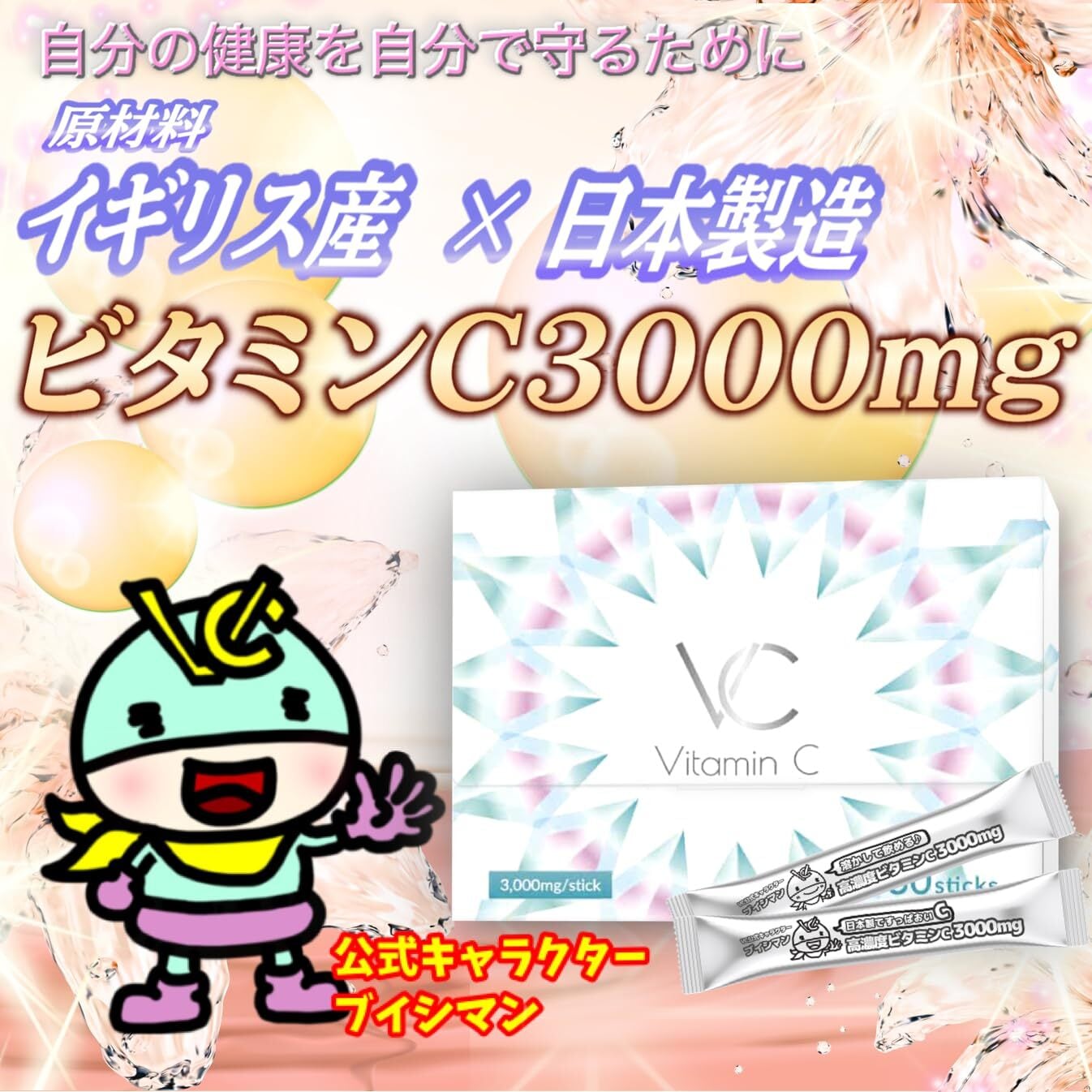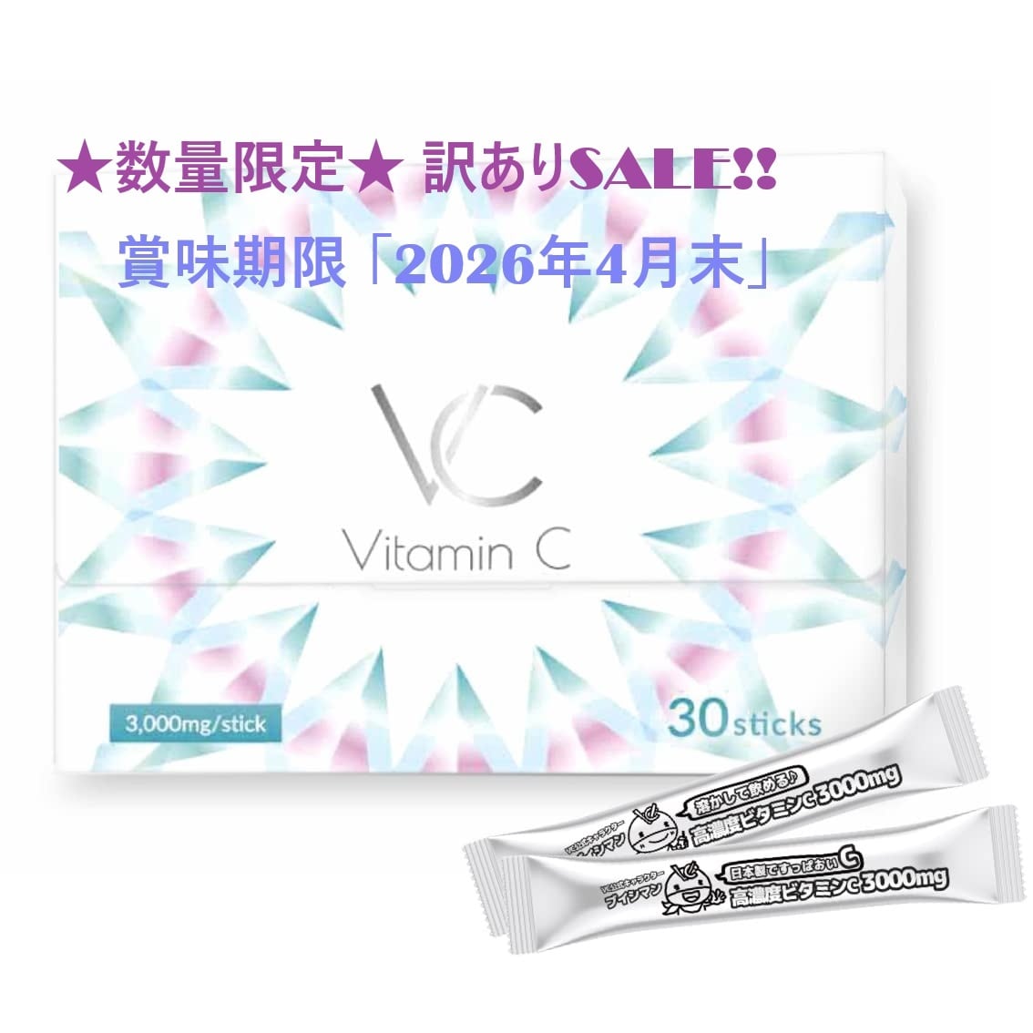 【訳ありSALE★特別価格★「2026年4月末」賞味期限】高濃度 ビタミンC 3000mg イギリス産 含有率96% サプリメント 粉末 スティック VC(ブイシー) 30包